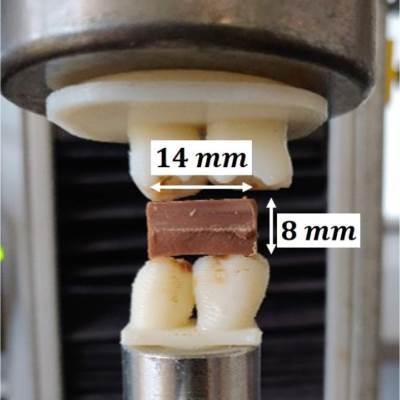 Влияние микроаэрации на фрагментацию шоколада при первом укусеИсследование распределения размеров фрагментов выявило чёткую разницу между не- и микро- аэрированным шоколадом. Образцы последнего распадаются на более мелкие кусочки по сравнению с неаэрированными образцами, т.е. микроаэрация способствует фрагментации - испытательный стенд с зубами