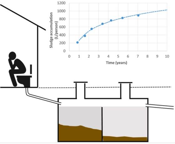 Исследования показали, что скорости накопления ила в 2-камерных септиках высоки в первые 12 месяцев работы системы после очистки от ила (примерно 250 л/чел./год), но падают до менее 150 л/чел./год через 2 года и менее 100 л/чел./год через 4 года. Эквивалентная измеренная общая скорость накопления сухих твердых веществ также снизилась с приблизительно 10 кг/чел./год через 12 месяцев до менее 3 кг/чел./год через 4 года. Из этих данных выведено уравнение, которое предсказывает оптимальное время опорожнения септиков на основе объема резервуара, количества жильцов домохозяйства и процента объема, заполненного шламом перед дешламацией.
