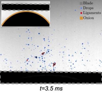 Когда лук разрезают, ферментативная реакция превращает соединения серы в пропантиаля S-оксид при разрыве тканей лука. Когда пропантиаля S-оксид достигает человеческих глаз, химикат активирует цилиарные нервы в роговице и вызывает слезы. Помимо летучести таких химических веществ, истинным виновником, как предположили, могут быть крошечные парящие капли, образующиеся во время резки. Однако не было никакого механистического обзора выброса капель при резке лука, подкрепленного экспериментами и визуализациями.